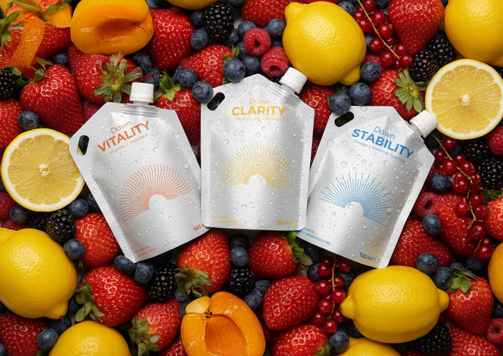 Questo progetto per il brand di integratori Syform prevedeva la creazione di una linea di succhi multivitaminici per la colazione chiamata Dawn (Alba). La linea comprende tre prodotti: Dawn Vitality, Dawn Stability e Dawn Clarity, presentati in formato pratico con beccuccio.